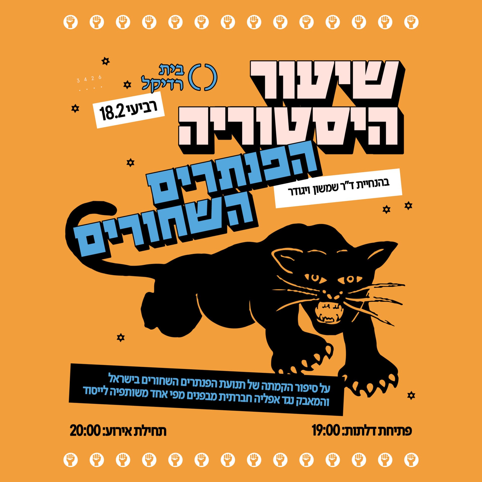 ההרצאה תעסוק בהיסטוריה של התנועה, מראשיתה בשכונת מוסררה בירושלים ועד השפעתה הרחבה על החברה והפוליטיקה בישראל. ד״ר שמשון ויגודר (כיום פסיכולוג), צעיר אשכנזי שהגיע מחוגי השמאל שהיה שותף להקמת הפנתרים וניסח את הכרוז הראשון שלהם, יספר את הסיפור גם מזווית אישית של מי שהיה שם.