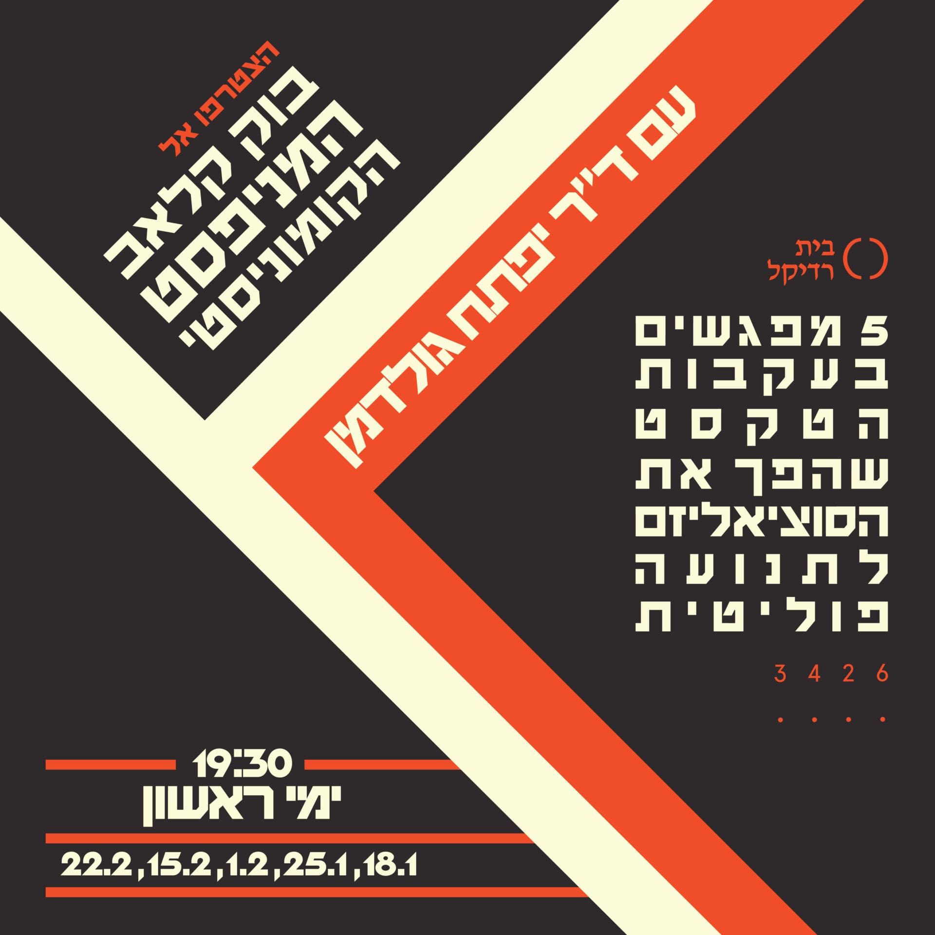 ניפגש בבית רדיקל עם ד”ר יפתח גולדמן, מומחה להגות סוציאליסטית, לסדרה של חמש פגישות שבהן נקרא את המניפסט הקומוניסטי, ננסה להתחקות על סוד קסמו, לפענח את הקודים והצופנים שמסתתרים בו וגם להשיב על השאלה- האם ובאיזה אופן הטקסט הזה עדיין רלוונטי עבורנו?