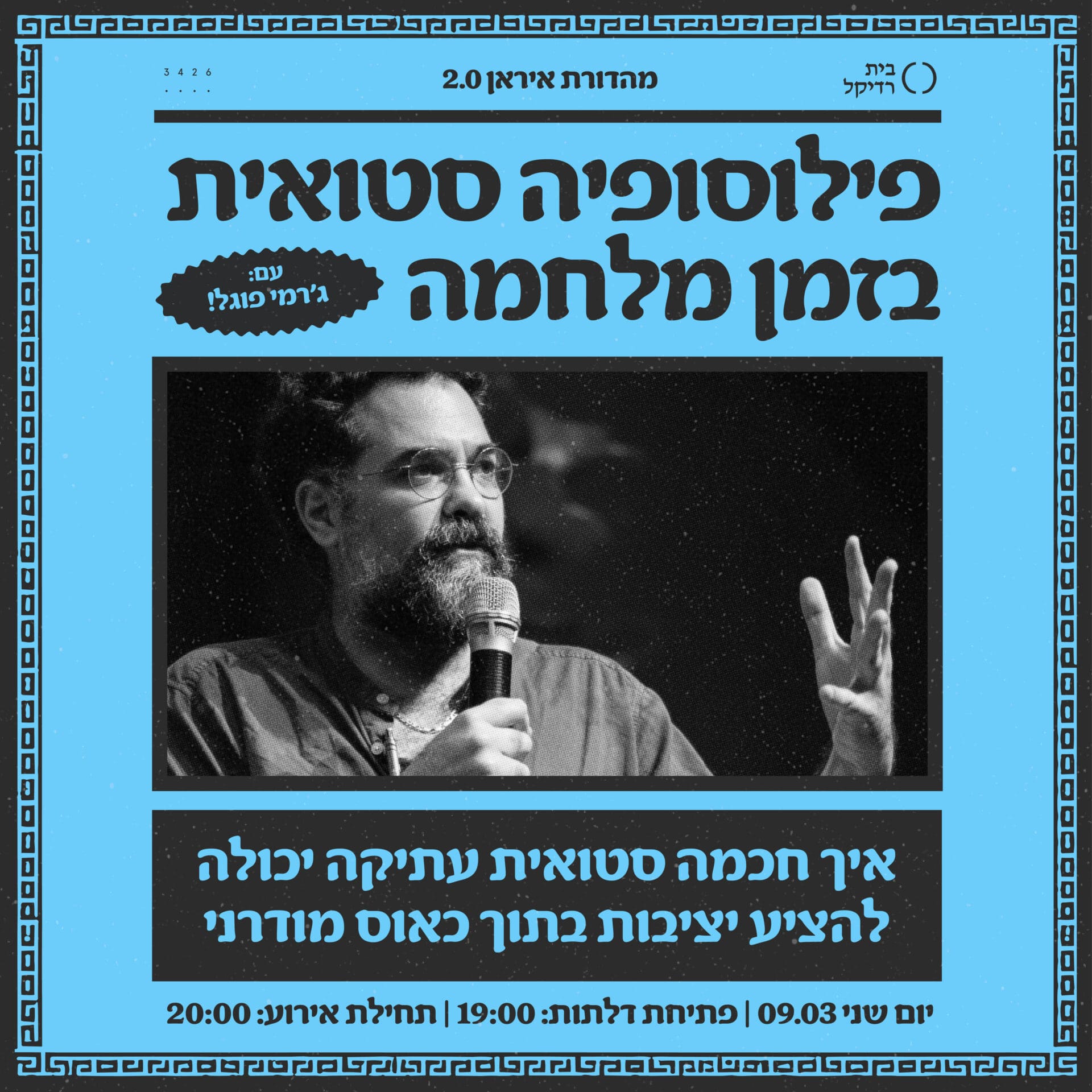 ניפגש בבית רדיקל עם ד”ר ג’רמי פוגל, שיעזור לנו להבין איך לחשוב, להרגיש ולפעול בתקופה שבה הכל מתערער. לא הרצאה פילוסופית באקדמיה – אלא כלים קיומיים לימי חירום. בואו למצוא רגע של נחמה, שקט והשראה.