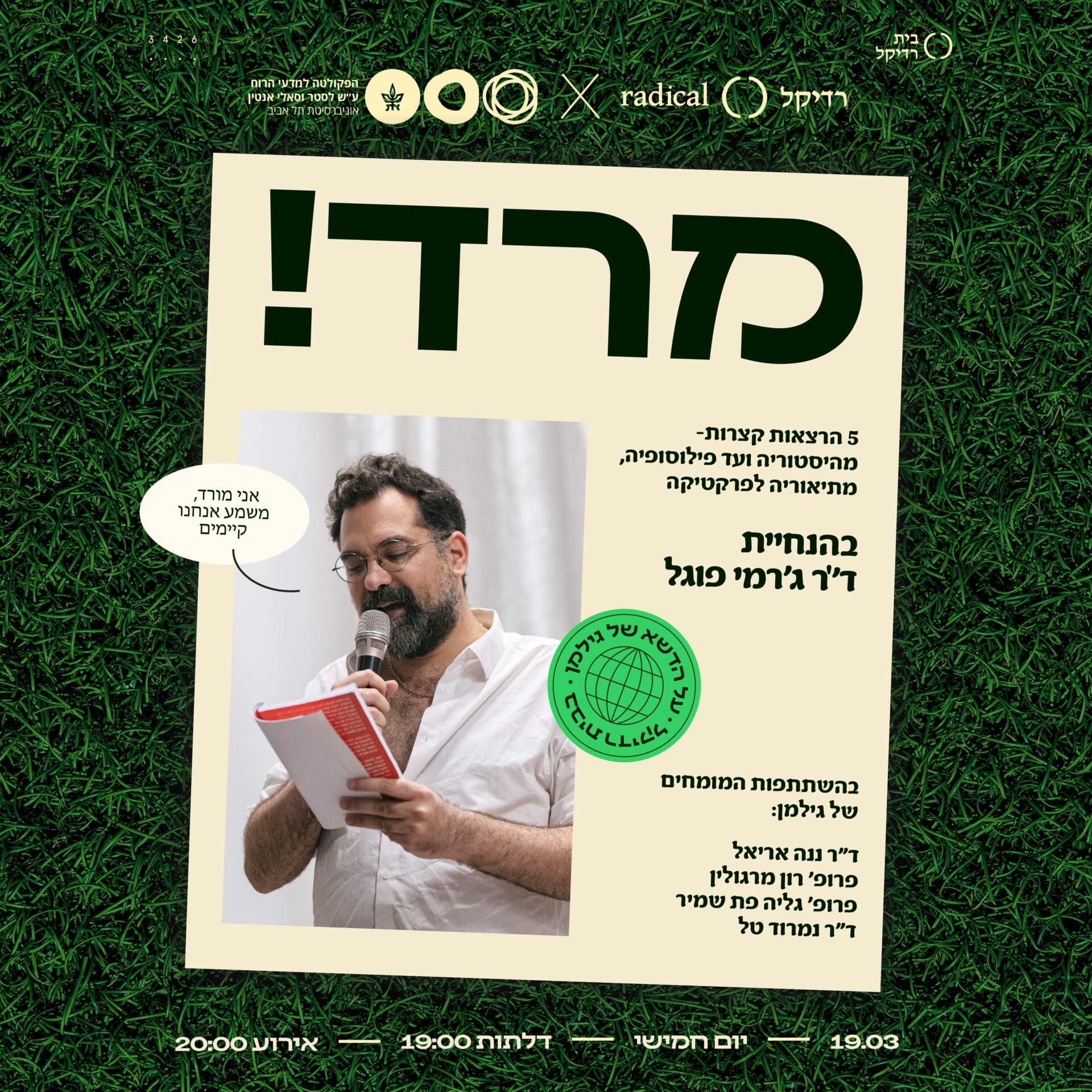 אחרי שנים של מחאה, הגיע הזמן לדבר ברצינות על מרד. מה המשמעות של זה, איך עושים את זה ולמה זה לא באמת קרה אף פעם בישראל? ד”ר ג’רמי פוגל והמומחים של גילמן יעלו עם חמש הרצאות קצרות, כל אחד והספין שלו על מרד – מהיסטוריה ועד פילוסופיה, מתיאוריה לפרקטיקה.