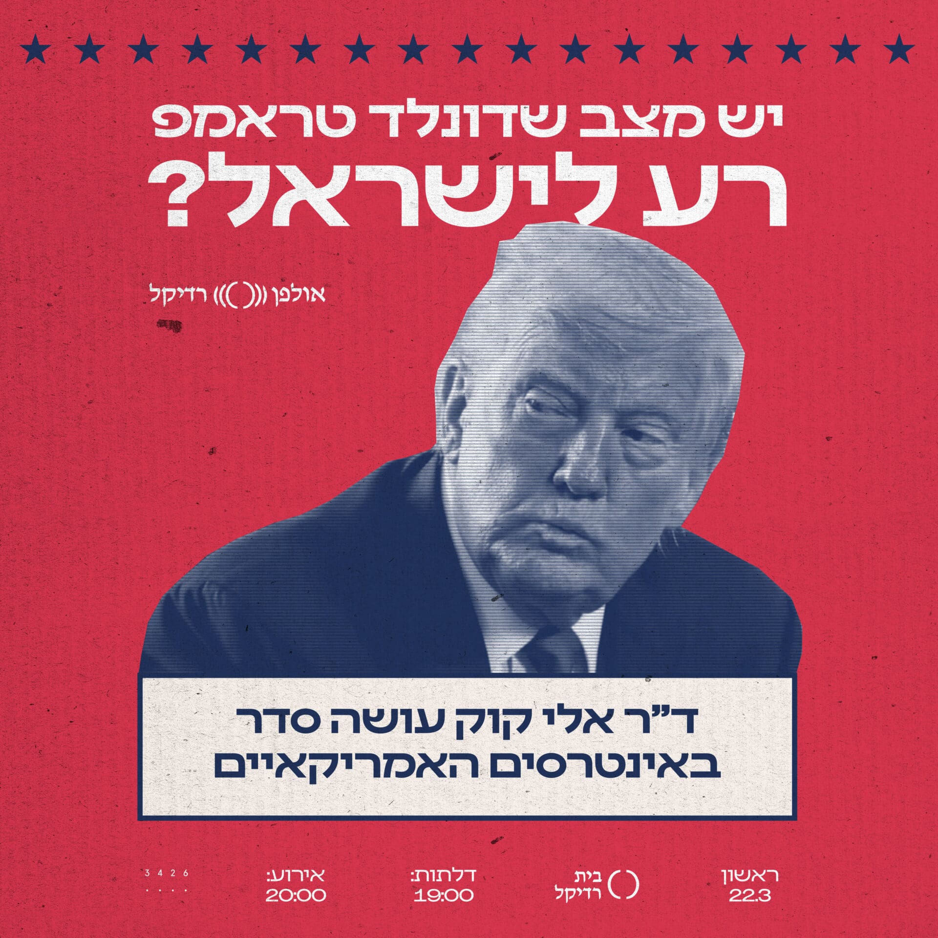 נפגש בבית רדיקל לערב שבו נבקש להסתכל מעבר לכותרות ולבחון את המדיניות של טראמפ כלפי ישראל והמזרח התיכון: מה האינטרסים שמניעים אותה, אילו השלכות ארוכות טווח היא מייצרת, ואיך היא משפיעה על מעמדה של ישראל בזירה הבינלאומית. ננסה לשאול: מה זה בכלל אומר “טוב לישראל”? האם מדובר בביטחון מיידי, בלגיטימציה בינלאומית, או בעתיד ארוך הטווח של האזור? ואיך כל זה מתחבר למציאות הפוליטית שאנחנו חיים בה היום?