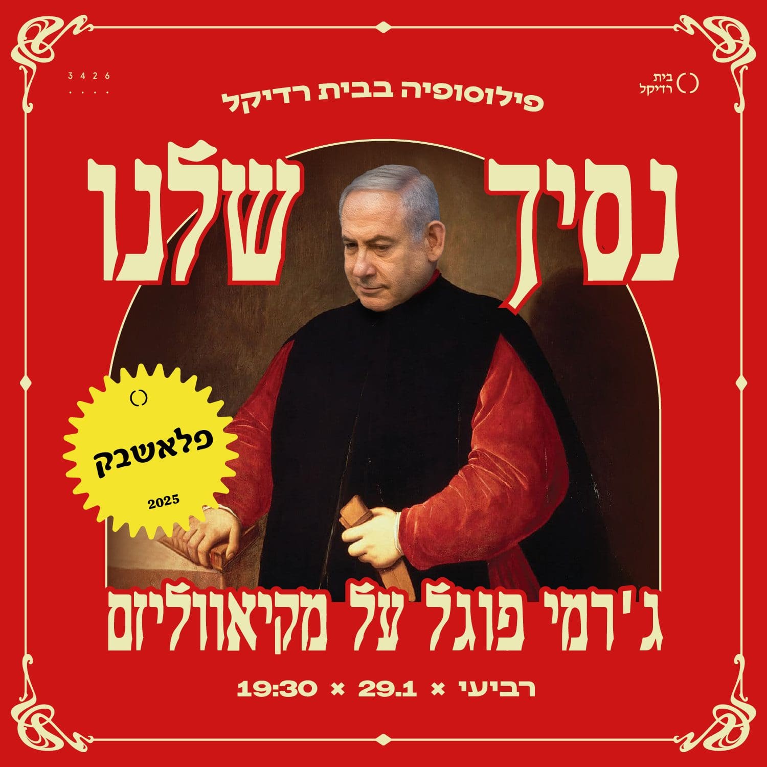 ב”נסיך”, מקיאוולי מסביר למי שתאב בשלטון איך להגיע אליו ולמי שנמצא בשלטון איך לשמר אותו. הוא נותן ניתוח מבריק, מקיף, מעמיק ושטני של כל השטיקים והטריקים מבלי להתייחס למוסר או טובות העם. בראש המדינה שלנו, עומד נסיך שתחתיו נבנה החמאס, תחתיו קרה השביעי באוקטובר, תחתיו נרצחים חטופים שהופקרו יחד עם האתוס הישראלי. ועדיין הוא בשלטון. למה? כי אין מקיאווליסט מבריק יותר מנתניהו. בהרצה נלמד את השטיקים ואת הטריקים של הנסיך של מקיאוולי דרך הטריקים והשטיקים של הנסיך שלנו, ונחשוב יחד על איך אפשר להפיל את ממשלת החורבן ולעודד הנהגה שפויה יותר.