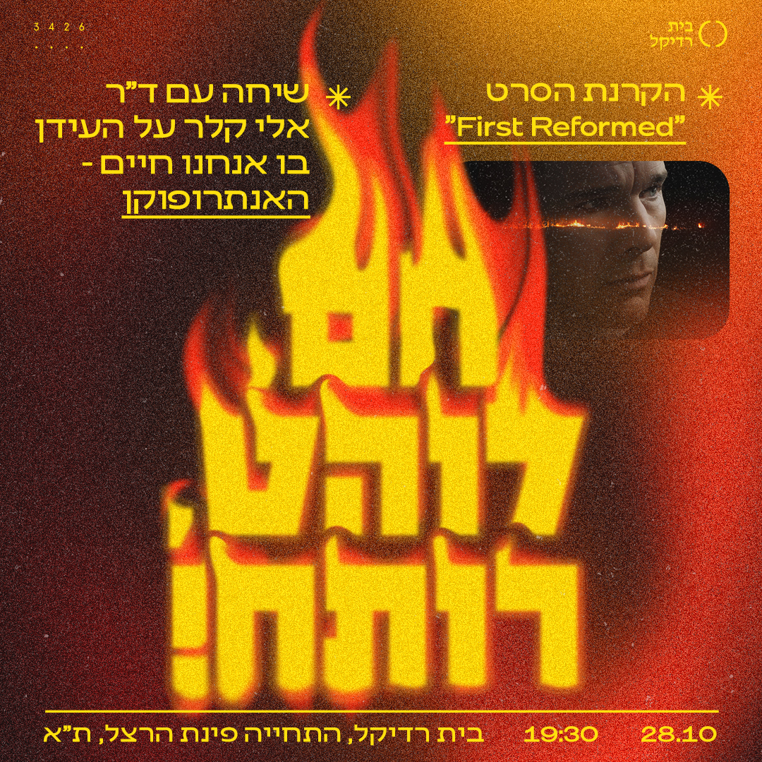 באירוע מיוחד נתחיל בשיחה עם ד”ר אלי קלר, על עידן האנתרופוקן – תקופה גיאולוגית שבה האדם עצמו הפך לכוח טבע מרכזי שמעצב את פני כדור הארץ. המשבר האקלימי, זיהום האוויר והים, קריסת מערכות אקולוגיות והכחדת מינים – כל אלה מציבים בפנינו שאלות קיומיות חריפות. ביחד ננסה להבין איך נמשיך לחיות כאן? והאם עדיין יש עתיד אפשרי? לאחר מכן נקרין את First Reformed של פול שרדר – הסרט עוקב אחר ארנסט טולר (אית’ן הוק), כומר בעיירה קטנה בניו יורק, שמוצא את עצמו במשבר רוחני עמוק כשהוא מתמודד עם שאלות של אשמה, אמונה ואפשרות לחיות בעולם הנמצא על סף קריסה אקולוגית. דרך עלילה מהורהרת ומינימליסטית, הסרט בוחן את הקשר שבין אמונה, אחריות סביבתית והמאבק למצוא משמעות בתקופה שבה העתיד נראה מאיים מתמיד.