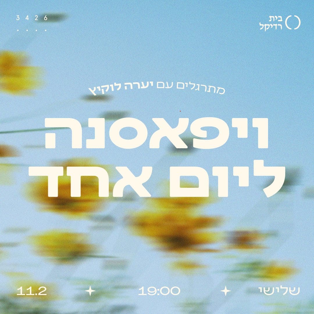 בשלישי בערב ניפגש לתרגול משותף. זמן לעצור ולהשקיט את המיינד, להתמקד במה שחשוב – לנשום, להרגיש כל מחשבה שעולה, כל תחושה, בעיניים טובות – בלי לשפוט או להילחם בהן. בהנחיית יערה לוקיץ, מורה מוסמכת למיינדפולנס ומתרגלת ויפאסנה למעלה מ-15 שנים. בתקווה לצאת עם יותר רוגע, יותר נוכחות, ותחושת שקט פנימי שיכולת ללוות אותנו הלאה ולתת לנו כוח להמשיך ~
