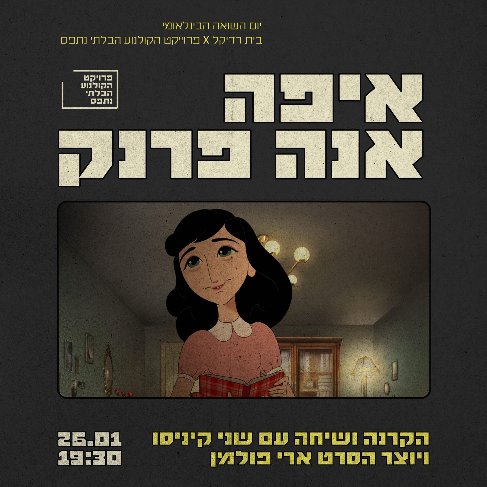 מציינים את יום השואה הבינלאומי בבית רדיקל בשיתוף פרויקט הקולנוע הבלתי נתפס. נקרין את סרט האנימציה “איפה אנה פרנק” של ארי פולמן (ואלס עם באשיר), שמספר את סיפורה של קיטי – הדמות הדמיונית מיומנה של אנה – שקמה לחיים בלב אירופה של ימינו ויוצאת למסע חיפוש אחר אנה, בעולם שכבר שכח איך נראית חמלה. בין זיכרון השואה למציאות של פליטים, גבולות סגורים ואדישות חברתית, הסרט יוצר חיבור חד ולא נוח בין עבר להווה.